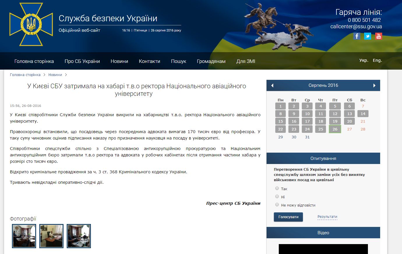 В Киеве сотрудники Службы безопасности Украины разоблачили во взяточничестве и.о. ректора Национального авиационного университета. Правоохранители установили, что чиновник через посредника адвоката требовал 170 000 евро от профессора.