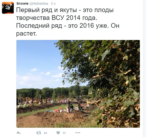 "Мне тут прислали фотографии с Овсяного кладбища в Снежном, о котором я неоднократно писала. Итак, в Снежном почивают "ополченцы" из Томска и Якутии. Первый ряд и якуты – это плоды творчества ВСУ 2014 года. Последний ряд – это 2016 уже. Он растет", - пишет автор блога.