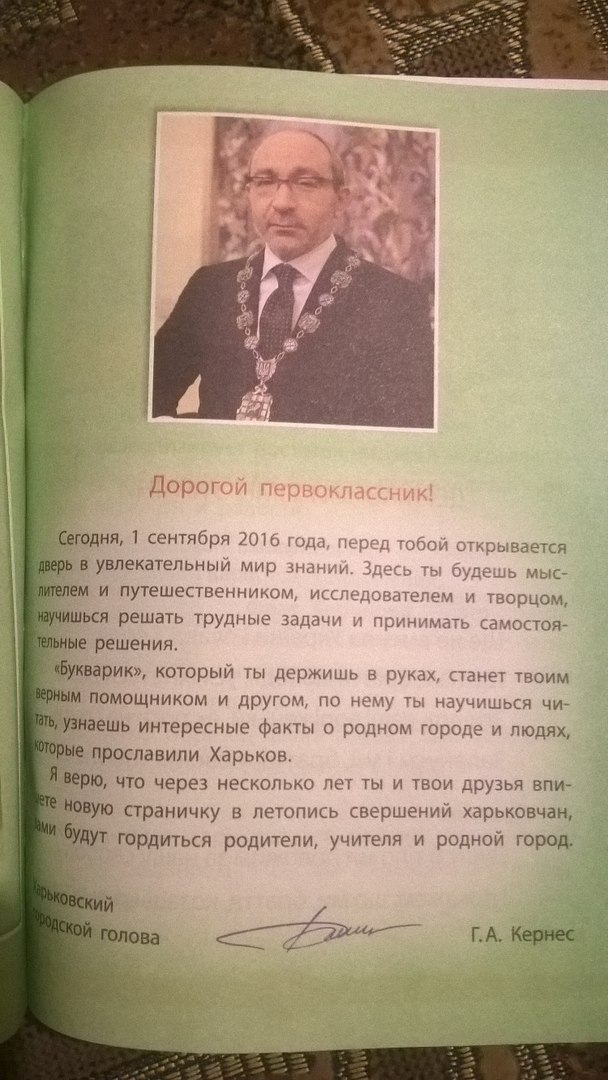Этот букварь в основном посвящен Харькову и начинается с обращения городского головы Геннадия Кернеса к детям.