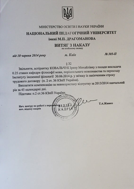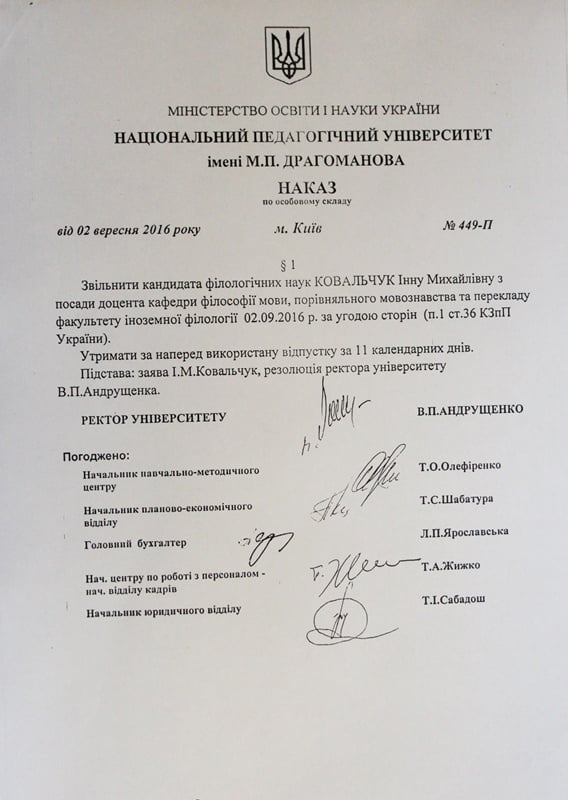 «Решением Ученого совета и профсоюзной организации факультета иностранной филологии ее действия расценены как аморальные и не достойные работника Национального педагогического университета имени М. П. Драгоманова. Такое же решение принято ректоратом, профсоюзным комитетом и студенческим советом университета. Заметим, что Ковальчук Инна Михайловна, осознавая значение своих действий, самостоятельно изъявила желание расторгнуть трудовые отношения с университетом и 02.09.2016 г. Приказом ректора № 449 уволена с занимаемой должности», - подчеркивается в заявлении ректора университета.
