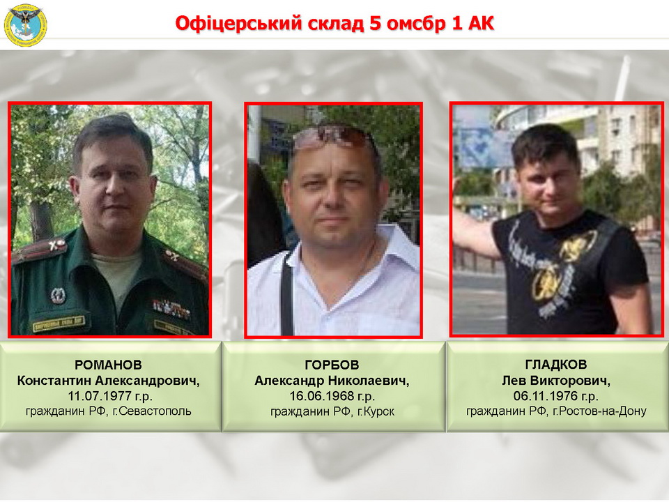 Эти российские военные непосредственно руководят подготовкой и ведением боевых действий на Волновахском направлении, которые направлены на срыв Минских договоренностей и уничтожение гражданской инфраструктуры Донбасса. Разведка установила, что 9 июня 2016 года танковое подразделение 5 омсбр обстреляло н.п.Новотроицкое и вызвало пожары и разрушение гражданских домов. В составе 1-го танкового батальона бригады идентифицированы 18 офицеров.