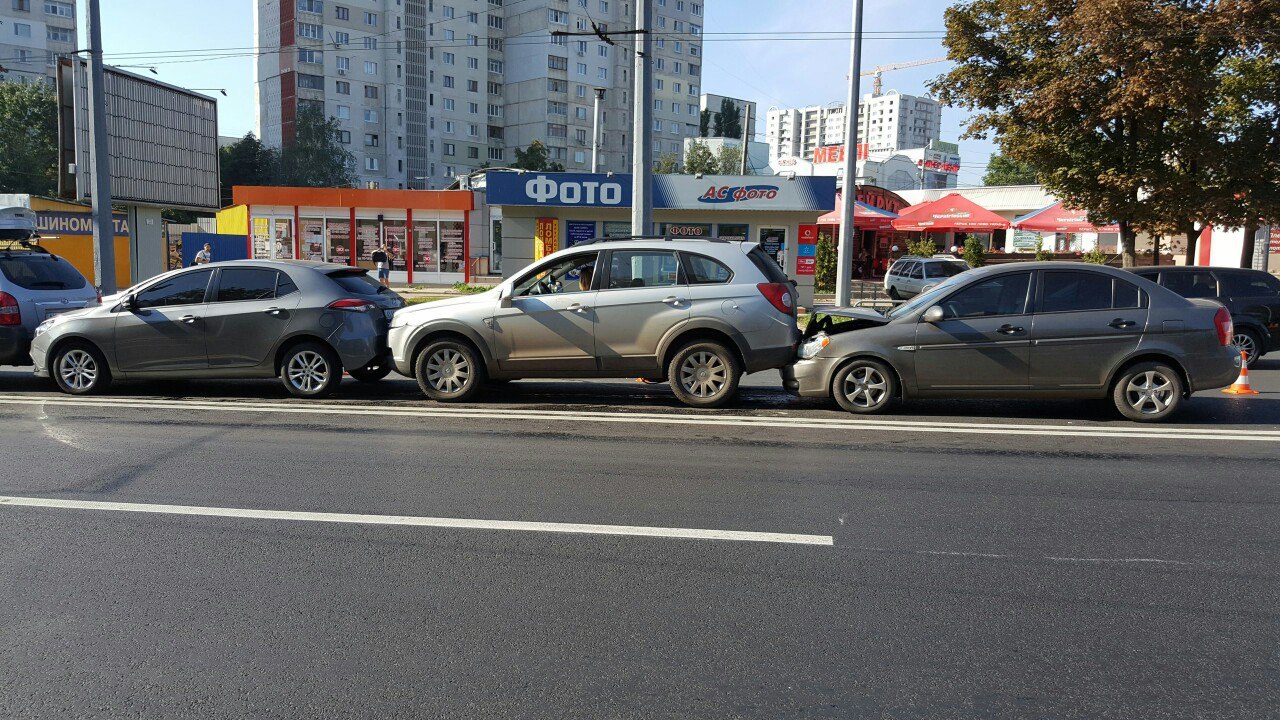 "Chevrolet Captiva ударила MG5, а Hyundai Accent ударил Каптиву. В результате этого столкновения впереди стоящие машины также по инерции столкнулись. Пострадавших нет", - сообщили в полиции.