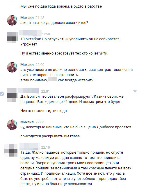 По его словам, боевики в батальоне Гиви находятся как в тюрьме, к ним относятся, как к рабам, не соблюдая условия "контракта". Сообщается, что "Гиви" угрожает тем, кто собирается уйти, и их арестовывает. Боевик считает, что Гиви движет страх перед тем, что его батальон будет расформирован.