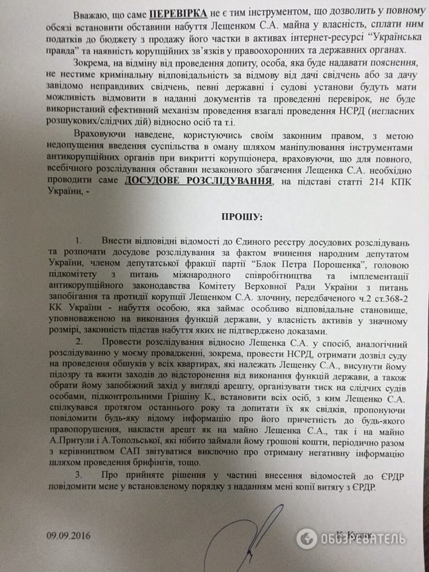Военный прокурор сил АТО Константин Кулик подал заявление в Национальное антикоррупционное бюро Украины с требованием арестовать народного депутата Украины Сергея Лещенко. Об этом свидетельствуют документы, которые публикует inforesist.