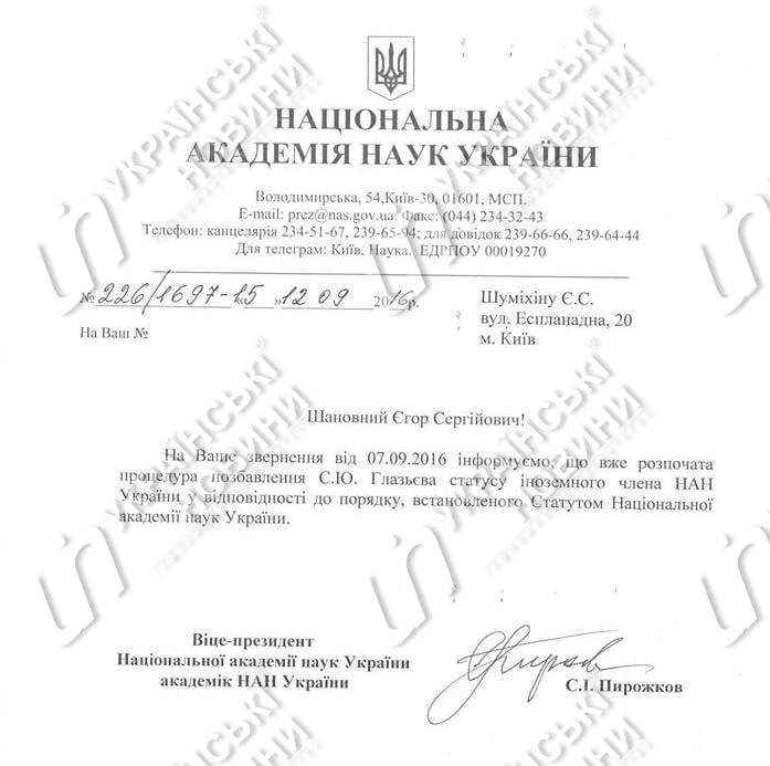 Начата процедура лишения Сергея Глазьева статуса иностранного члена НАН Украины в соответствии с порядком, установленным уставом Национальной академии наук Украины