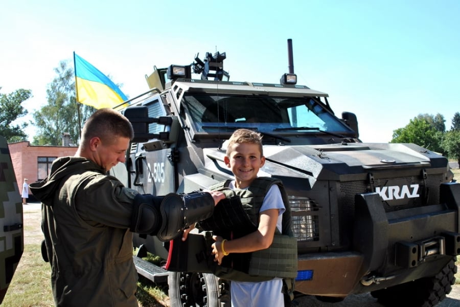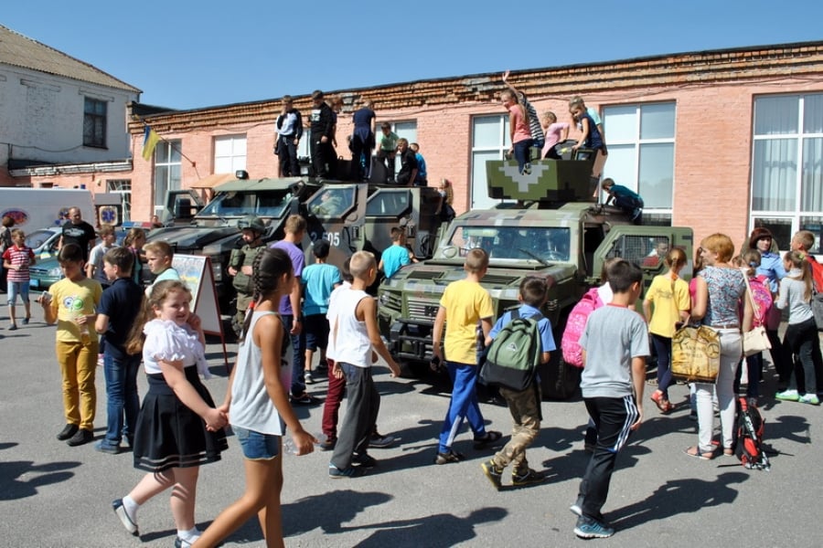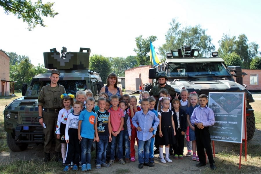 Нацгвардийцы прибыли в учебное заведение на военных бронеавтомобилях «Кугуар и Спартан», которые вызвали большой интерес у школьников.