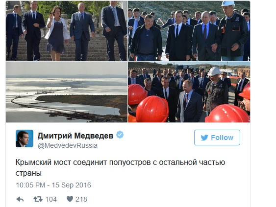 Пост был опубликован 15 сентября около 19:39, но к полуночи твит был удален. На его месте появилось новое сообщение: "Крымский мост соединит полуостров с остальной частью страны".