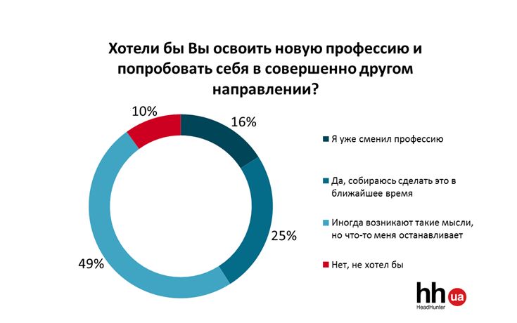 Как показал опрос hh.ua, только один из десяти офисных сотрудников не хотел бы попробовать себя в другом направлении. Остальные либо уже сменили профессию, либо собираются сделать это в ближайшем будущем. В частности, планируют переквалификацию четверть опрошенных. Еще половина, не смотря на желание сменить род деятельности, не могут решиться на это по ряду причин.