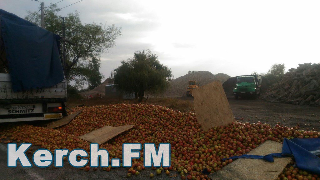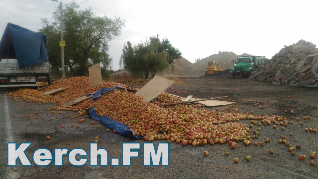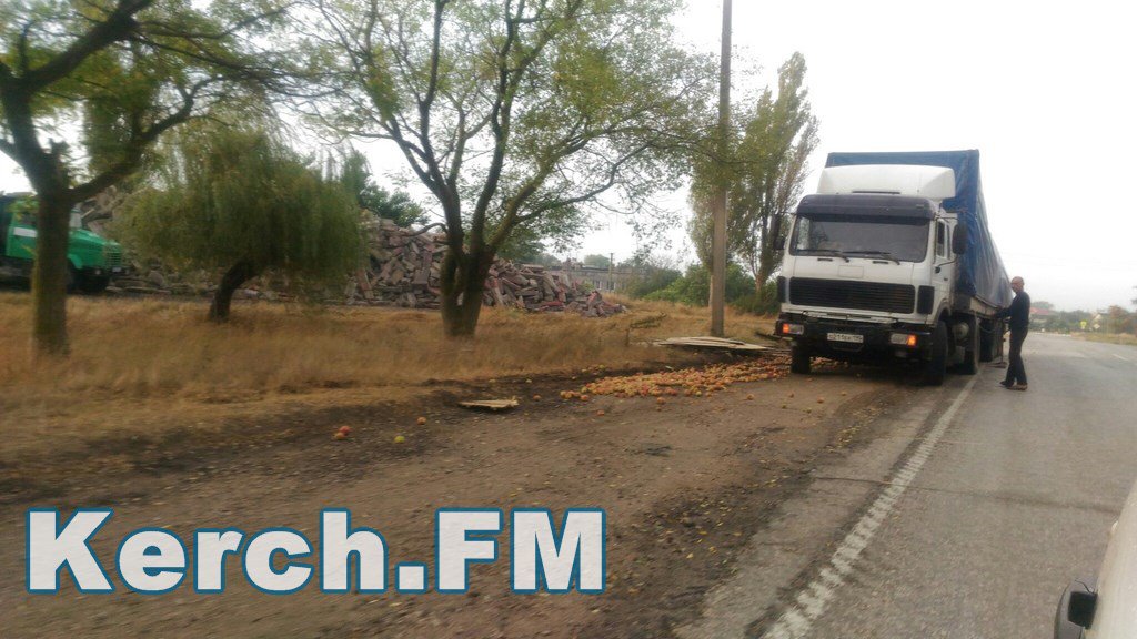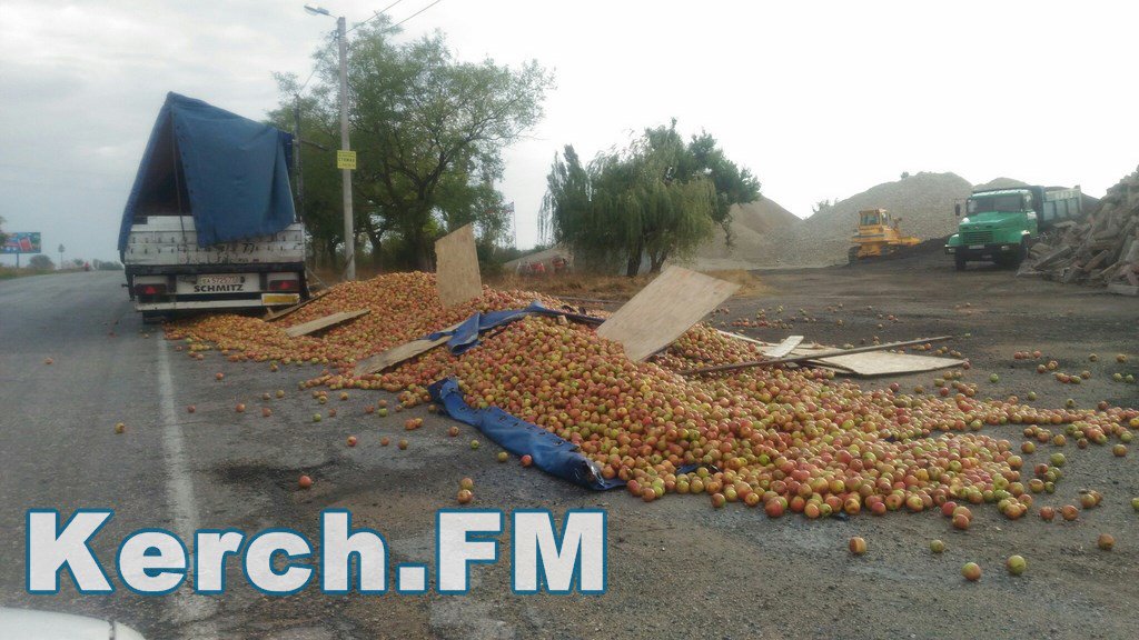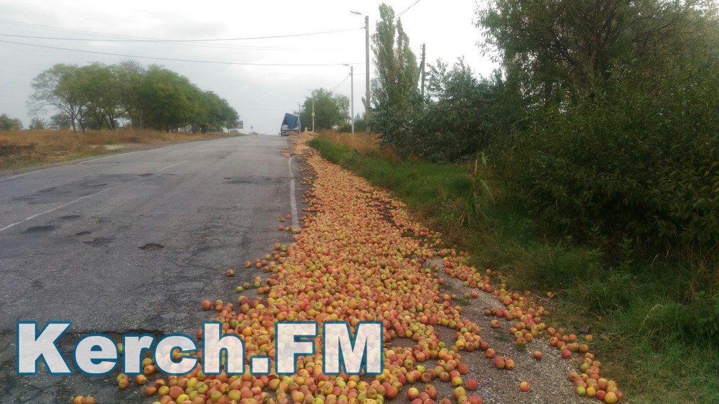 По дороге на Керченскую переправу, в районе Стройгородка, 20 сентября, из фуры высыпались тонны яблок. Как передает Керчь.ФМ, предположительно, яблоки рассыпались из-за того, что из-за нагрузки не выдержал каркас кузова.