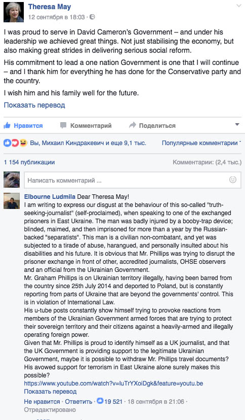 В комментариях под записью премьер-министра Великобритании Терезы Мэй в Facebook появилось обращение пользователя Ludmila Elbourne, попросившей главу правительства лишить проездных документов журналиста Грэма Филлипса, рекламирующего терроризм на востоке Украины. Обращение вышло в топ комментариев под постом Мэй, набрав больше 19,5 тысяч лайков.