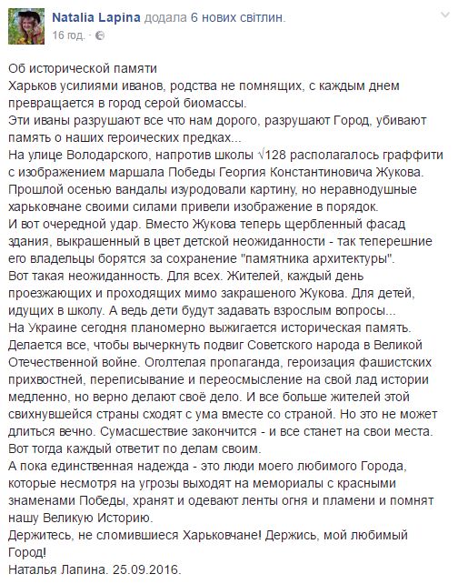 При этом, некая "харьковчанка" Наталья Лапина, используя обороты "НА Украине", утверждает, что таким образом в Харькове разрушают все "что ей дорого" и убивают память о "ее героических предаках".