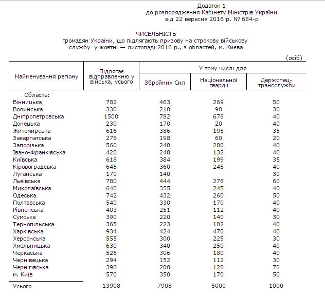 Кабинет министров Украины назвал 26 сентября численность граждан, попадающих под призыв на срочную военную службу в октябре-ноябре 2016 года. Согласно опубликованному в понедельник на сайте правительства распоряжения № 684-р от 22 сентября, в октябре-ноябре 2016 году до Вооруженных Сил Украины и другие военные формирования для прохождения срочной военной службы военкоматы попытаются найти 13908 человек.