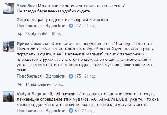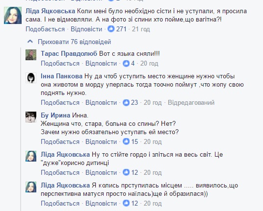 "Когда мне было необходимо сесть и не уступали, я просила сама. И не отказывали. А на фото со спины кто понимает,что беременна?!", "Ну да чтоб уступить место женщине нужно чтобы она животом в морду уперлась тогда тоочно поймут ,что *опу свою поднять нужно", "Я на 8-9 месяце отказывалась ехать сидя в общественном транспорте, а уступали место ВСЕГДА!!!", "Девочки у меня не однократно был случай когда уступали место а беременные просто отказывались. Хотели постоять или ехали одну остановку. Не судите по фото, вы не знаете сути", - пишут комментаторы.