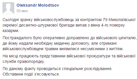 В Николаеве в результате падения с 4-го этажа казармы погиб военнослужащий-контрактник 79-й отдельной десантно-штурмовой бригады. Об этом сообщил в Facebook пресс-офицер бригады Александр Молодцов.