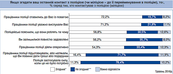 Социологи отмечают, что большинство тех, кто контактировал с полицией, выразили полное или частичное удовлетворение действиями полицейских (56,2%), отметив их внимательность (72,9%), уважительное отношение (72,2%), оперативность (54,3 %). Почти 72 % опрошенных не согласились с утверждением, что полицейские намекали на то, чтобы гражданин давал им деньги или подарки. Еще более 78 % отрицали, что полиция применяла силу, когда это не было нужно.