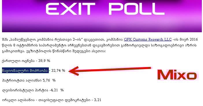 Ранее неформальный лидер ЕНД, экс-президент Грузии Михаил Саакашвили заявил журналистам, что будет доверять экзит-полу, который проведет компания GFK и будет обнародован телекомпанией "Рустави 2".
