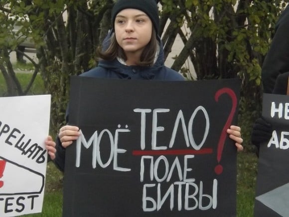 Мужчины и девушки в пикетах на Марсовом поле стояли с плакатами «Не пугайте женщин адом. Вы уже создали его для нас», «Церковь хочет запрещать, а мы будем просвещать!», «Оставьте женщине право выбора!», «Государство лезет в матку, видно все в стране в порядке», «Матку царству не дарила».