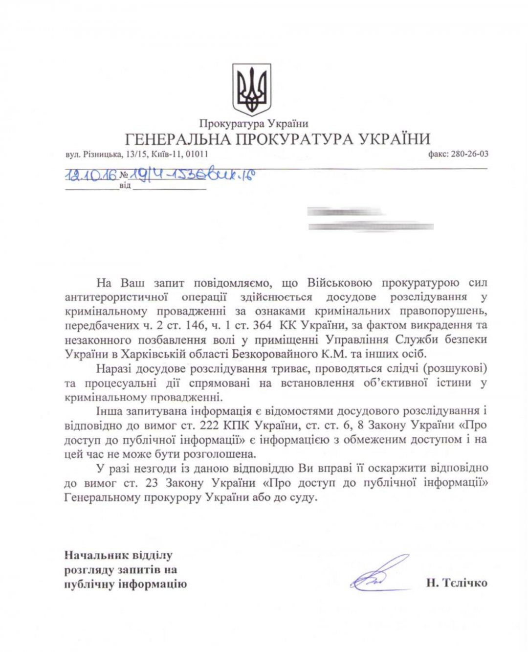 Военная прокуратура сил АТО осуществляет досудебное расследование по факту похищения и незаконного лишения свободы в помещении управления Службы безопасности Украины в Харьковской области Константина Бескоровайного, Виктора Ашихмина, Николая Вакарука и других лиц, о которых шла речь в докладе правозащитников организаций Amnesty International и Human Rights Watch.