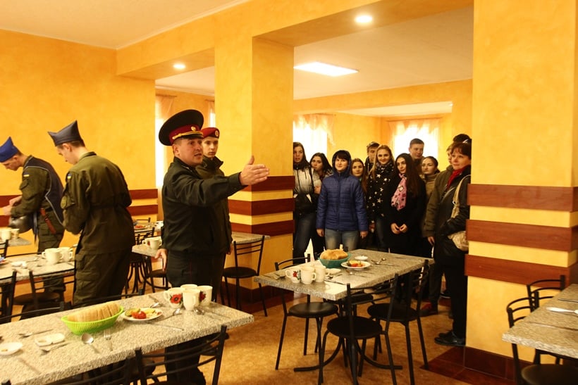 Вторая часть - ознакомление с учебно-материальной базой и выставками специальной техники, вооружения, новейших средств связи, формы одежды и снаряжения, экскурсия по учебным помещениям, тренажерному залу, огневому комплексу, столовой и музею Академии.