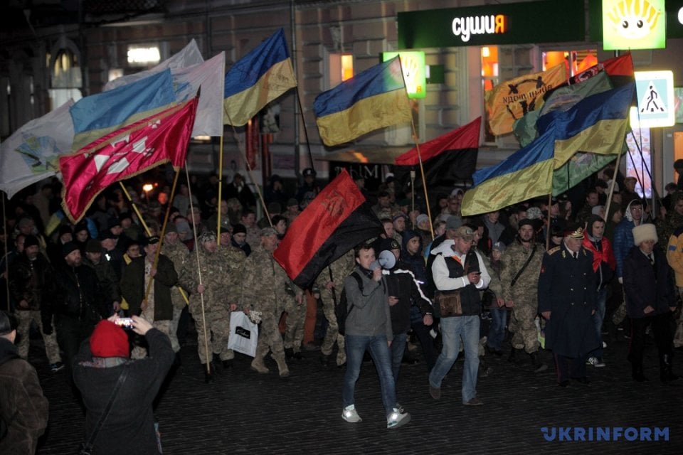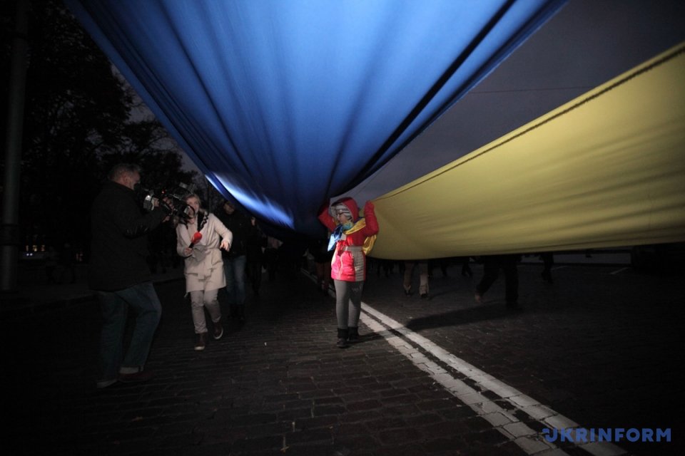Собравшись, харьковчане построились в колону, подожгли факелы и пошли маршем по улице Сумской. Марширующие пели Гимн Украины, и национальные песни.