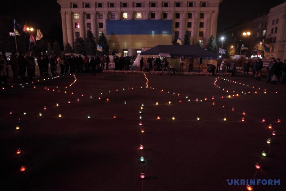 Жители города выложили на площади огромный герб Украины из зажженных лампадок.