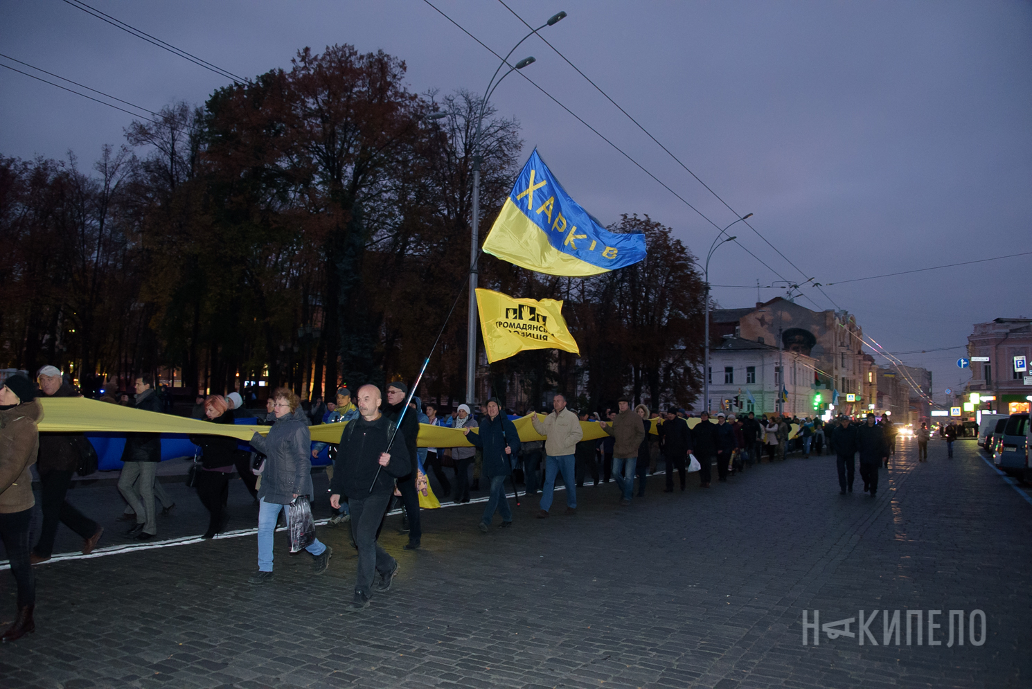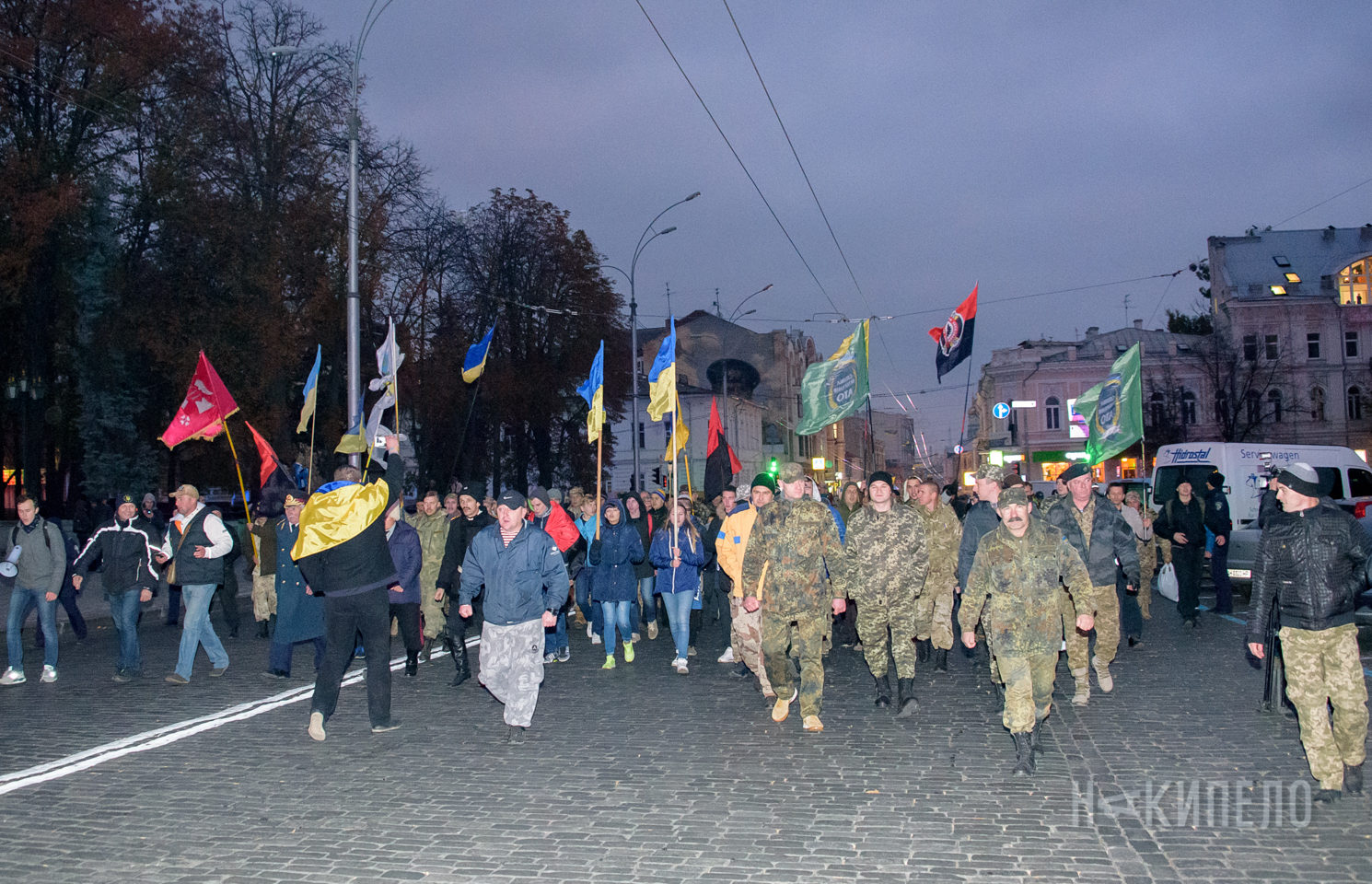 Сегодня, 14 октября, Марш непокоренных собрал патриотически настроенных харьковчан, бойцов и ветеранов АТО. После короткого митинга на площади Конституции колонна прошлась по улице Сумской до площади Свободы. Участники шествия скандировали патриотические речевки.