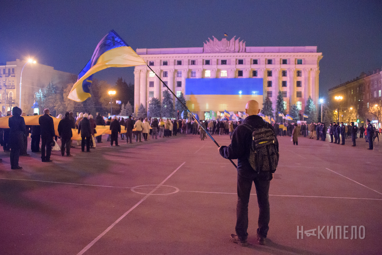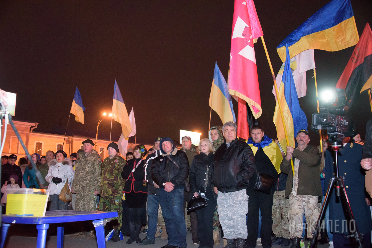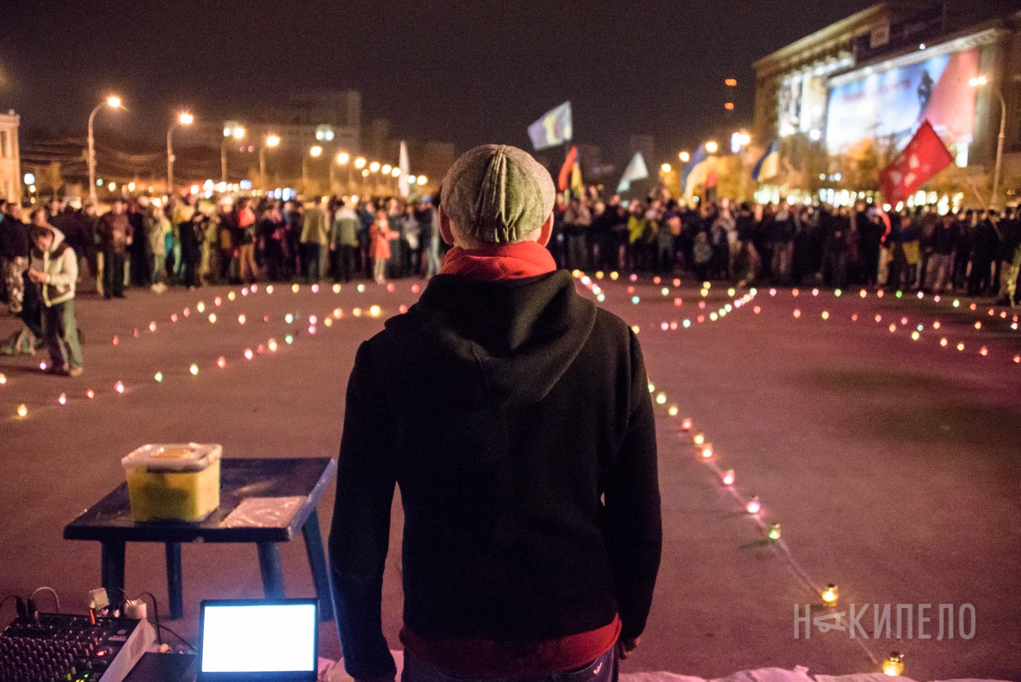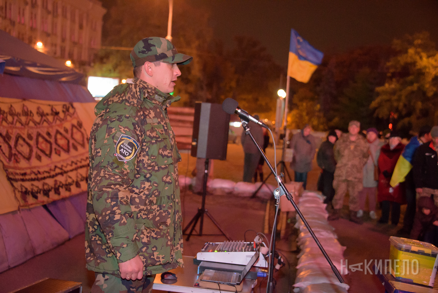 На площади Свободы активисты исполнили гимн и помянули погибших защитников Украины минутой молчания. Перед собравшимися выступили бойцы АТО, волонтеры и поэты, пишет Накипело.