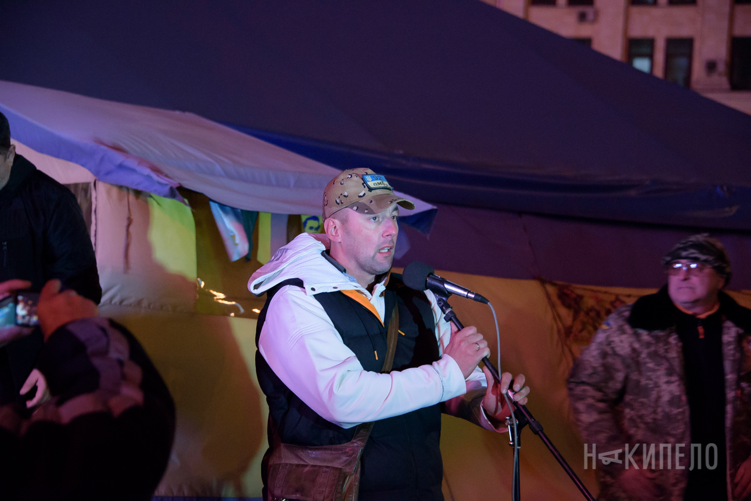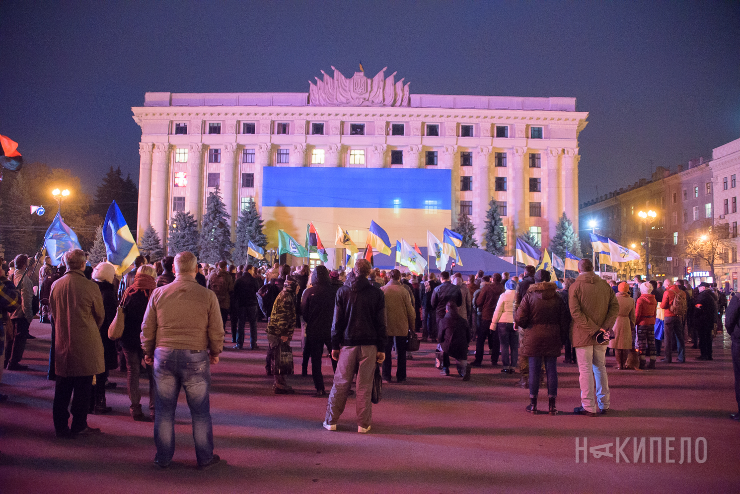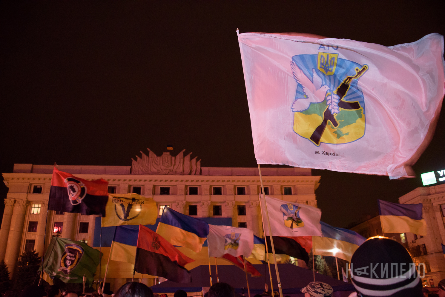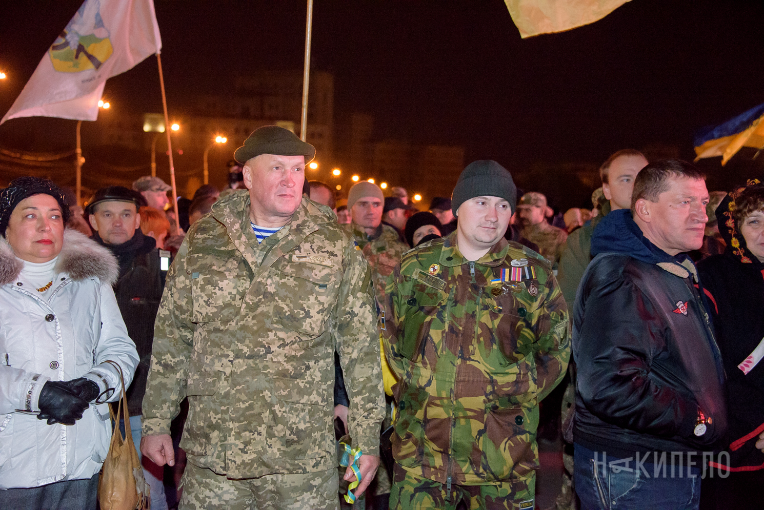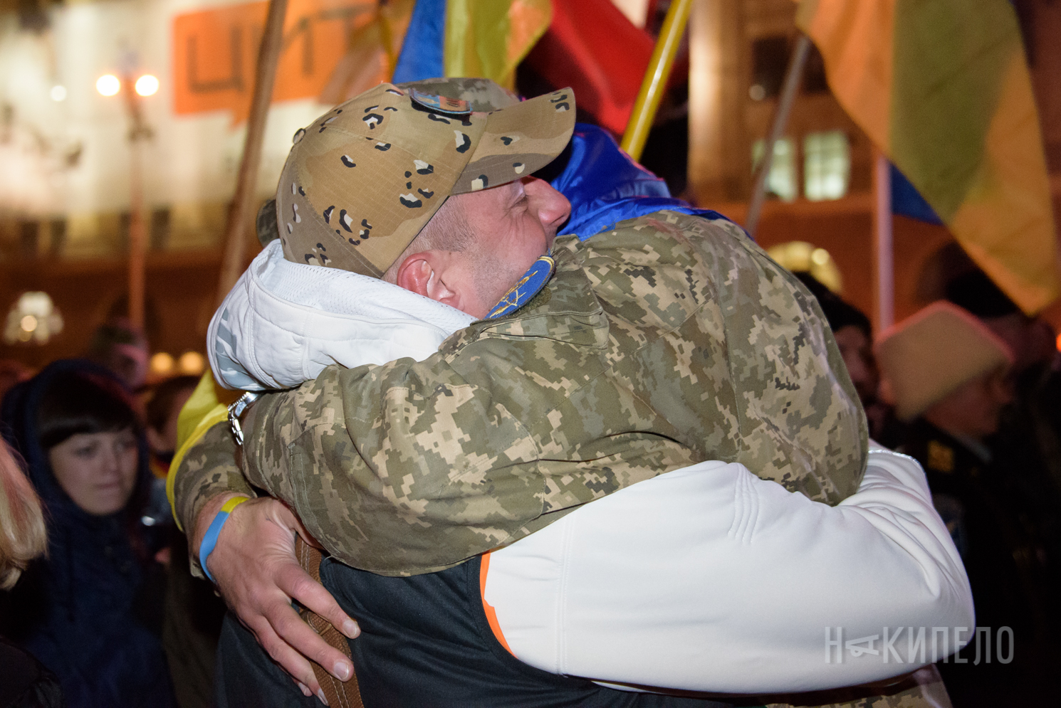 На площади Свободы активисты исполнили гимн и помянули погибших защитников Украины минутой молчания. Перед собравшимися выступили бойцы АТО, волонтеры и поэты, пишет Накипело.