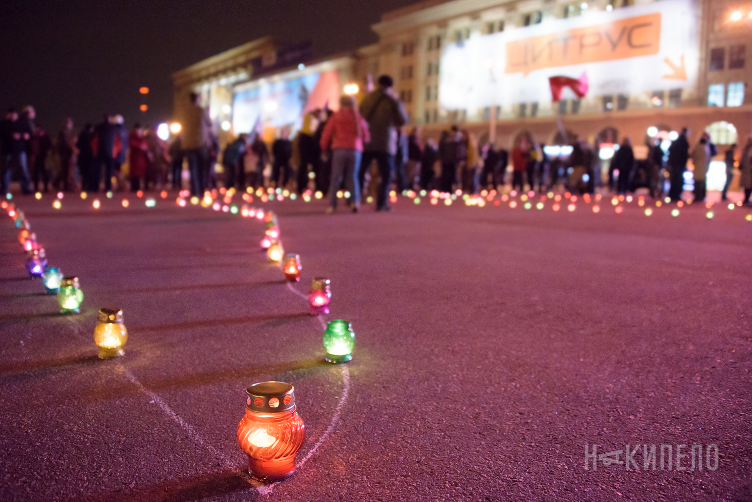 Митингующие возложили цветы к памятнику героям, погибшим за свободу и независимость Украины. На площади из лампадок патриоты выложили национальный герб.