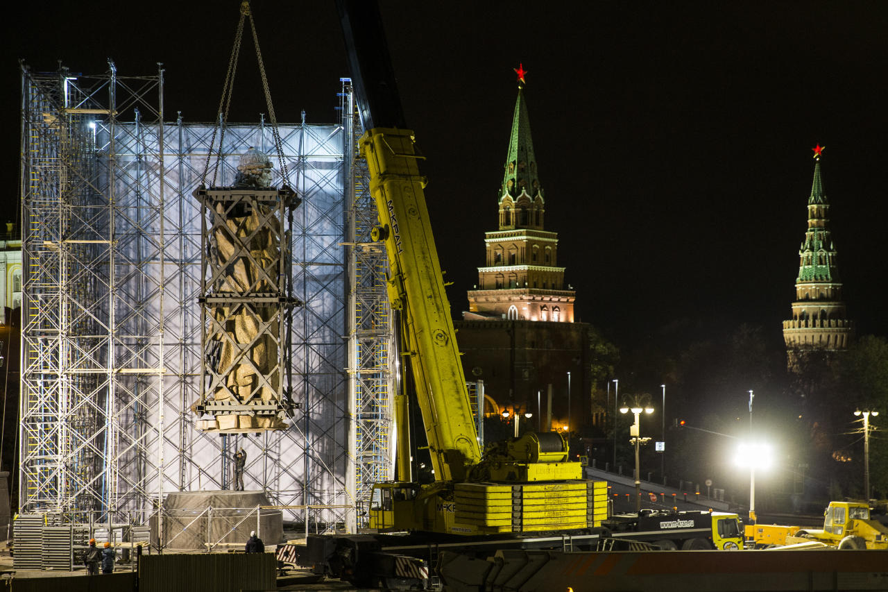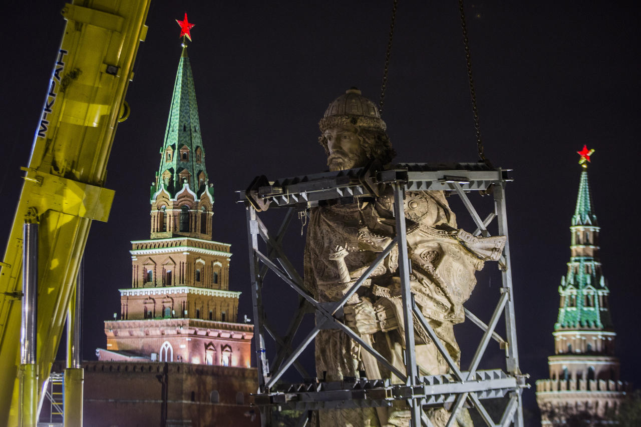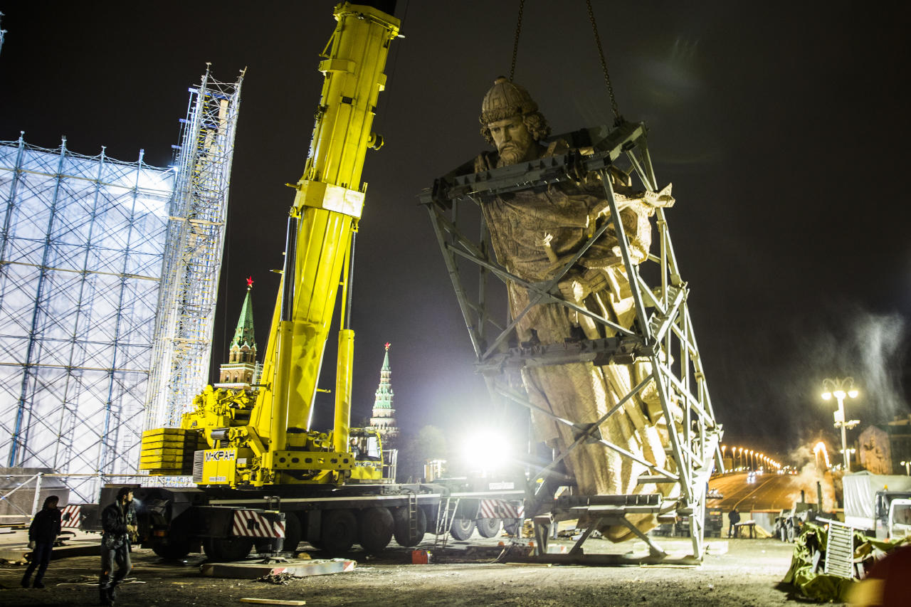 На Боровицкой площади в Москве в ночь на воскресенье, 16 октября, началась установка памятника князю Владимиру работы российского скульптора Салавата Щербакова. Монумент, высота которого вместе с постаментом составит почти 20 метров, монтируют прямо у стен Кремля. На место сварочных работ из мастерской в Химках по частям доставили отдельные фрагменты: основной каркас, правую руку и крест.