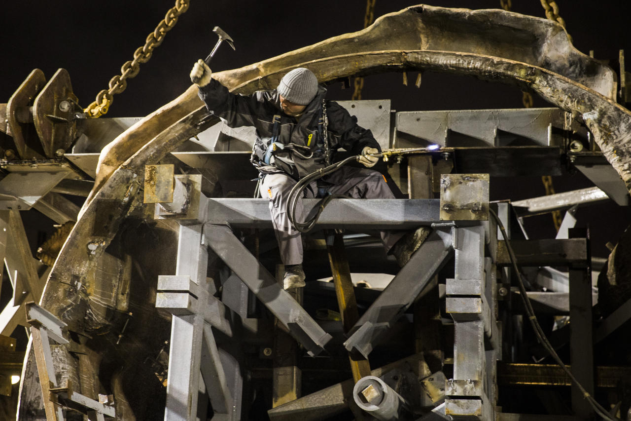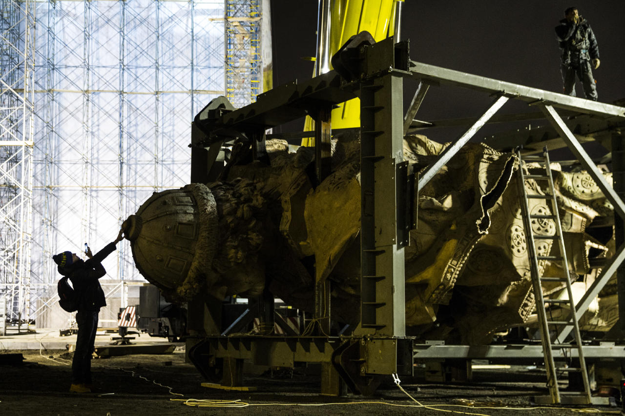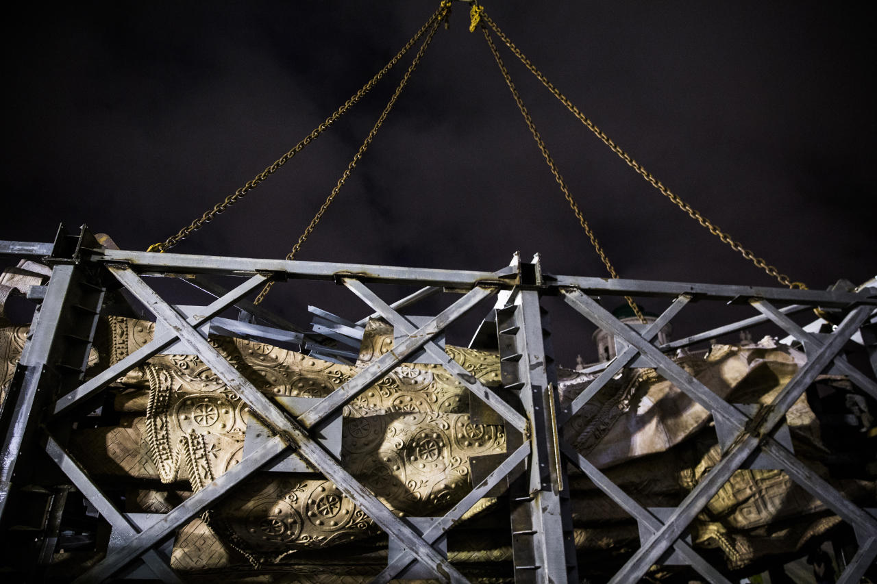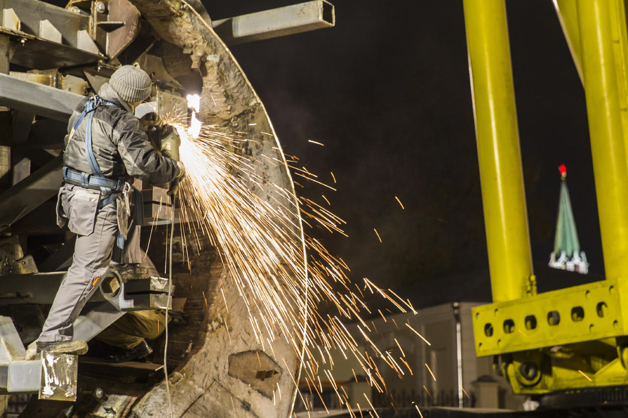 На Боровицкой площади в Москве в ночь на воскресенье, 16 октября, началась установка памятника князю Владимиру работы российского скульптора Салавата Щербакова. Монумент, высота которого вместе с постаментом составит почти 20 метров, монтируют прямо у стен Кремля. На место сварочных работ из мастерской в Химках по частям доставили отдельные фрагменты: основной каркас, правую руку и крест.