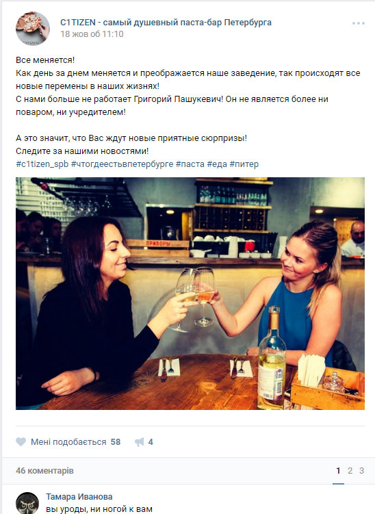 Эта история началась несколько дней назад, когда пришло сообщение о том, что в Донецке взорвали сепаратиста Арсения Павлова (известного по прозвищу Моторола). На это в своей социальной сети отреагировал шеф-повар петербургского бара Григорий Пашукевич.