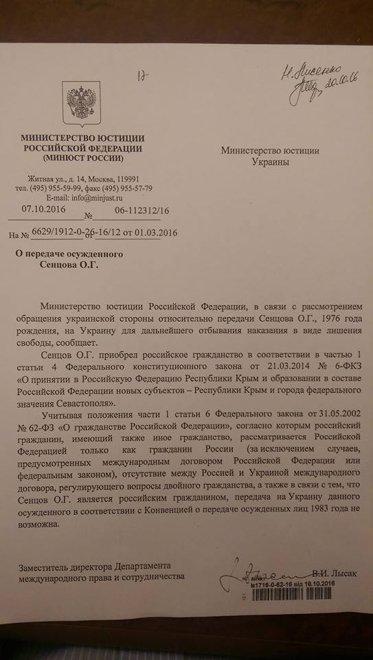 Российские власти отказали Украине в передаче осужденного режиссера Олега Сенцова, написал на своей странице в фейсбуке заместитель министра юстиции Украины по вопросам европейской интеграции Сергей Петухов.