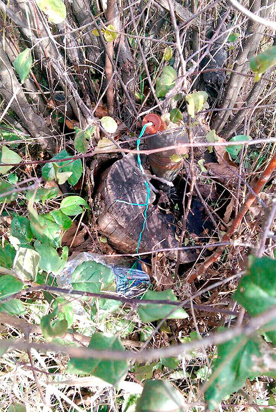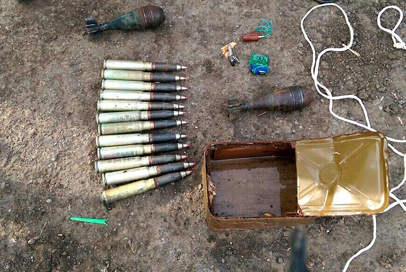 Вчера вблизи стационарного блокпоста нацгвардицев в районе населенного пункта Ясеноватая во время проведения мероприятий инженерной разведки бойцами в кустах были обнаружены 2 мины 82 мм с механическим взрывателем, взрывное устройство на растяжке с радиоуправляемым взрывателем и 30 мм артиллерийские снаряды.