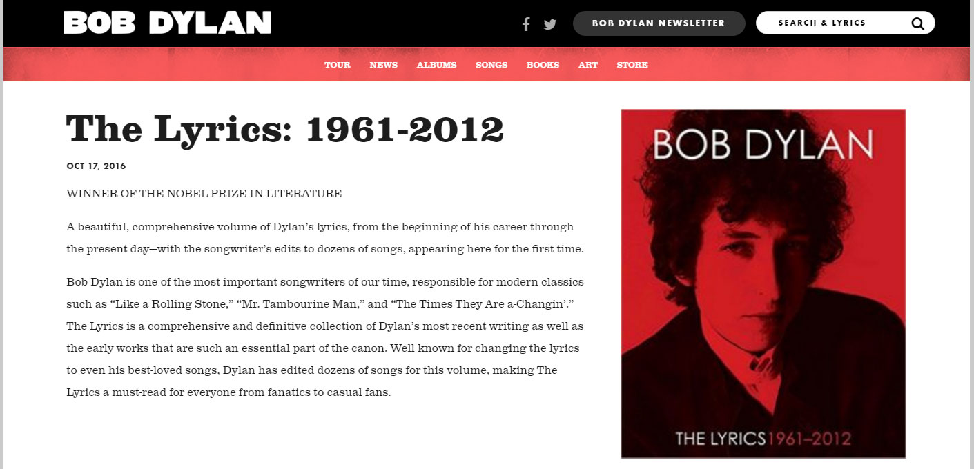 Слова «Победитель нобелевской премии по литературе» (winner of the Nobel prize in literature) появились на странице о новой книге с тестами песен Дилана, которая датирована 17 октября (такое же упоминание есть в записи про книгу в официальном фейсбуке музыканта).