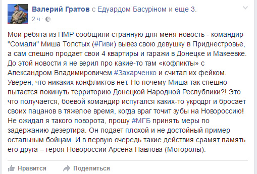 "Мои ребята из ПМР сообщили удивительную для меня новость - командир "Сомали" Миша Толстых (Гиви) вывез свою девушку в Приднестровье, а сам спешно продает свои 4 квартиры и гаражи в Донецке и Макеевке", - рассказал он.