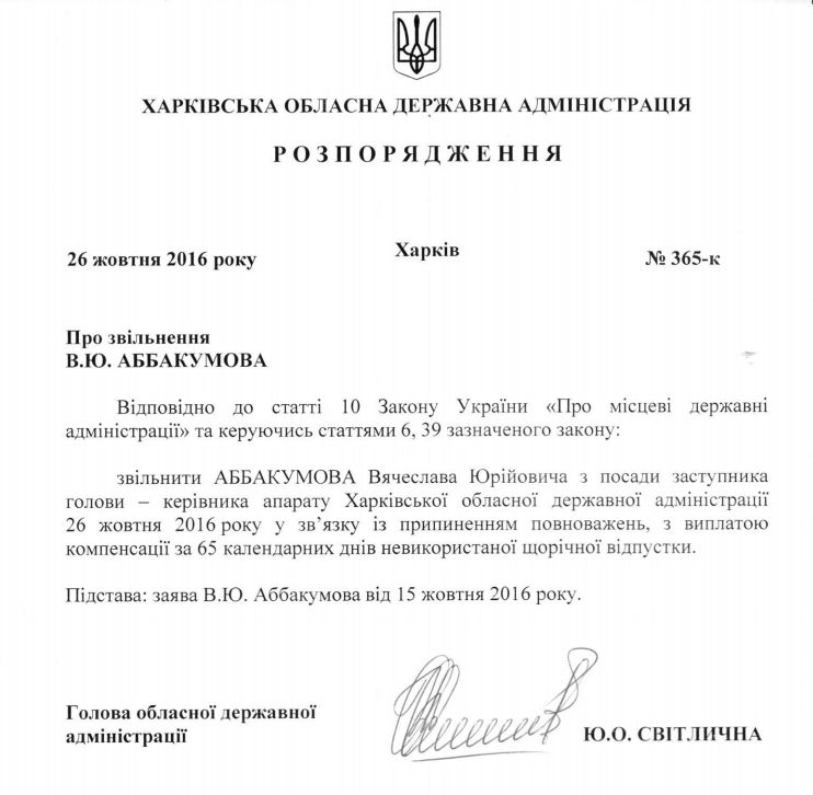 Вячеслав Аббакумов уволен с должности заместителя председателя Харьковской облгосадминистрации - руководителя аппарата обладминистрации. Соответствующее распоряжение опубликовано на сайте местной обладминистрации.