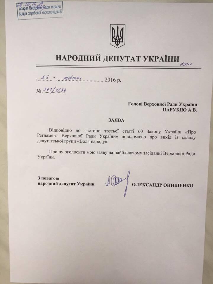 "Согласно части третьей статьи 60 Закона Украины "О регламенте Верховной Рады Украины" сообщаю о выходе из состава депутатской группы "Воля народа", - говорится в заявлении.