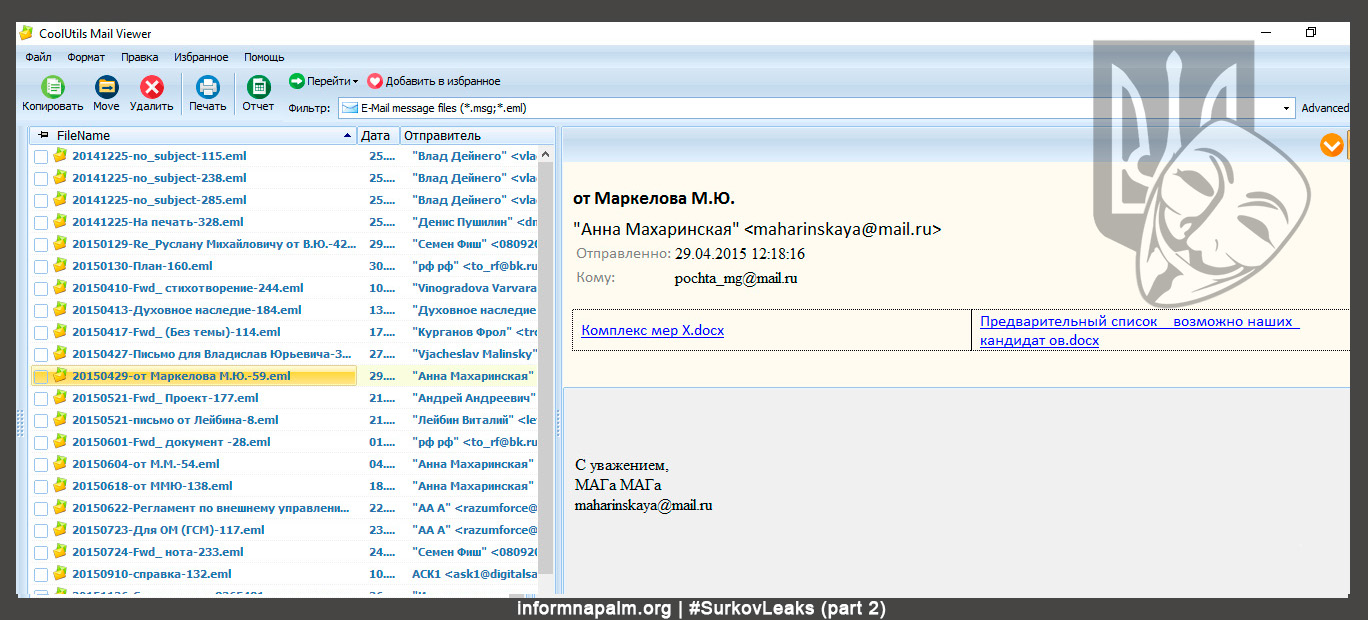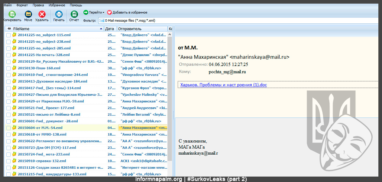 По информации разведывательного сообщества InformNapalm, сегодня, 3 ноября, украинский Киберальянс опубликовал очередной массив данных о письмах, которые получал Сурков.