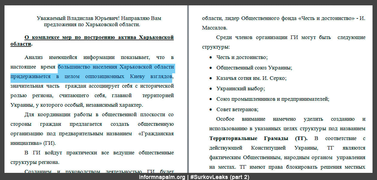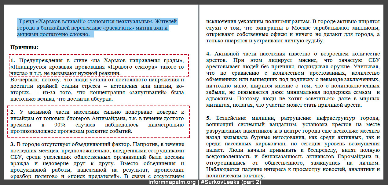 Например, в докладной записке от 29 апреля 2015 года под названием «Комплекс мер Х» сообщают, что большинство населения Харьковской области придерживается оппозиционных Киеву взглядов и предлагают варианты раскачивания ситуации.