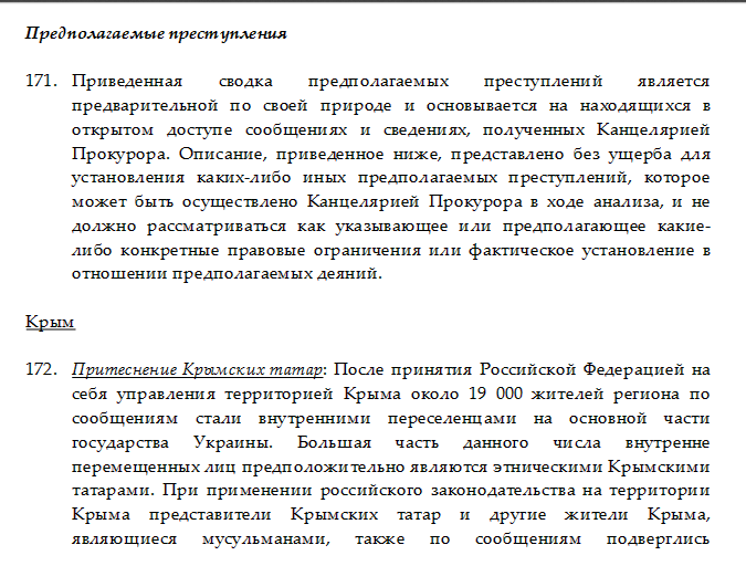 В частности, преступлениями РФ в Крыму называют притеснение крымских татар, убийства и похищения людей, противостоявших оккупации Крыма, аресты и жестокое обращение с людьми, а также принудительную военную службу.