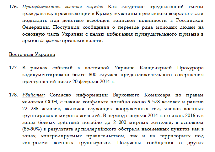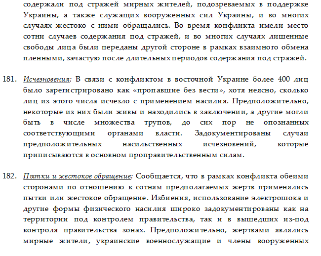 В отчете перечислены такие преступления России в восточной Украине, как убийство, разрушение гражданских объектов (в том школ и детсадов) артиллерийскими и минометными обстрелами, аресты и содержание под стражей, исчезновения, пытки и жестокое обращение, а также сексуальное насилие.