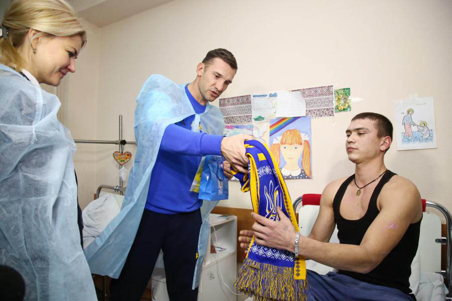 Председатель Харьковской облгосадминистрации Юлия Светличная, главный тренер сборной Украины по футболу Андрей Шевченко и игроки национальной команды посетили Военно-медицинский клинический центр Северного региона.