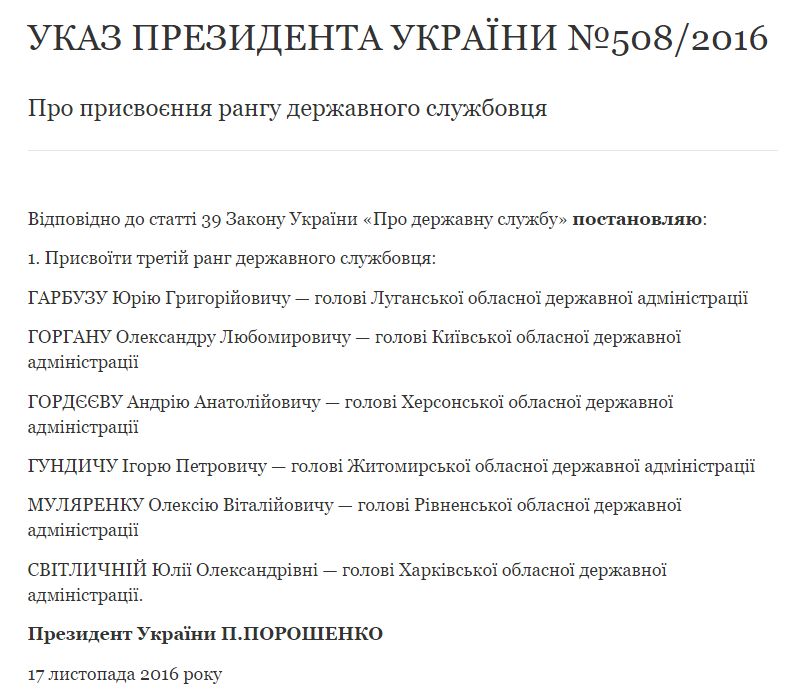 Указ президента Украины №508 / 2016 «О присвоении ранга государственного служащего» 17 ноября опубликован на сайте главы государства.