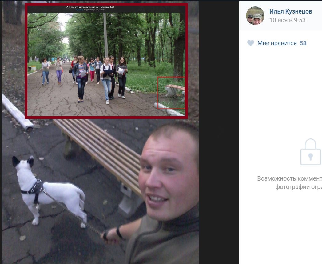 На одной из фотографий, загруженной в соцсеть в ноябре, Финогин выгуливает бультерьера. Этот снимок помог точно установить местонахождение российского разведчика. Волонтеры устанновили. что фото сделано в Парк культуры и отдыха им. Горького в Горловке. Об этом говорят характерные лавочки и потрескавшийся асфальт.