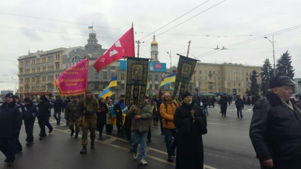 В самом начале шествия люди спели гимн Украины. В колонне также замечены представители духовенства и участники АТО.