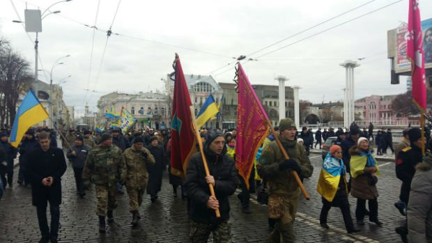 Люди, которые двинулись от площади Конституции в направлении площади Свободы, держат национальные флаги, символику общественных организаций, а также скандируют "Слава Украине - героям слава", "Украина понад усе".