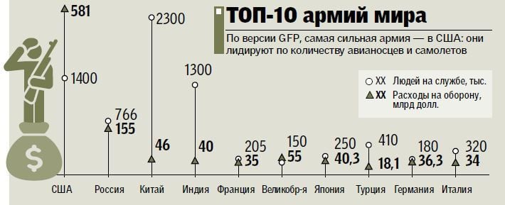 Тройка лидеров, в лице США, России и Китая остается неизменной в течение трех последних лет. В частности, в 2016 году, как и во все предыдущие годы, американская армия берет громадным военным бюджетом — $ 581 млрд. На втором месте по военным расходам идет Китай — $155 млрд, на третьем месте — Россия $46 млрд. Китайская армия является наиболее многочисленной — 2,3 млн солдат. Это больше, чем у США и России, вместе взятых (1,4 млн и 766 тыс., соответственно). Однако российская армия серьезно превышает китайскую по количеству бронетехники и авиации. В частности, ВС РФ имеют на вооружении почти 46 тысяч танков и боевых бронированных машин (втрое больше, чем у китайцев) и 3547 летательных аппаратов (в китайской армии — 2942). В то же время армия США обладает мощнейшим военно-морским флотом, в составе которого находятся 19 авианосцев (один у китайцев и один у россиян) и крупнейшим в мире воздушным флотом — 13 444 различных самолетов и вертолетов. "США, Россия и Китай располагают наиболее многочисленными армиями и больше всего тратят на оборону. Этим и объясняется их лидерство в рейтинге", — резюмировал Сергей Згурец.