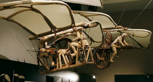 Леонардо Да Винчи. Велосипед воссоздан в масштабе 1:2, имеет размах крыльев 5 метров и оснащен устройством для управления полетом.