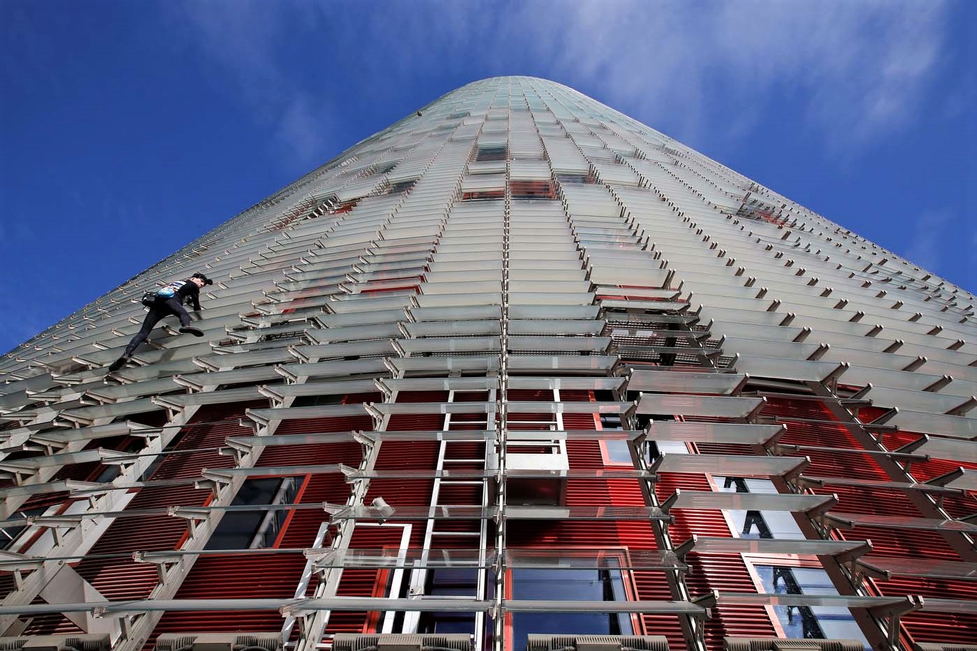Свое восхождение на Агбар Ален Робер начал в полдень на глазах изумленных прохожих и туристов на барселонской площади Les Glòries. Всего, чтобы подняться и спуститься по выступающим козырькам окон здания, у альпиниста ушло около часа.